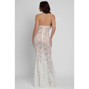Description from retailer: Indulge in pure luxury with our Saltair Lace Bustier Maxi Dress. Made with soft, body-contouring stretch lace, this stunning body-con silhouette effortlessly flatters your figure with its flared hemline and halter design. This white lace maxi dress also features wired bustier cups giving extra shaping and hold where you need it. Upgrade your wardrobe this spring with this ultra-luxe lace dress.