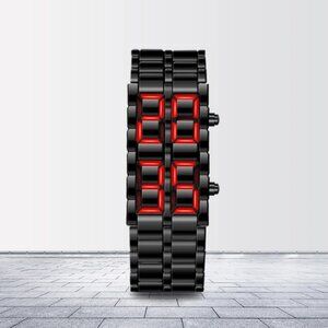 LED Digital Watch, Black & Red Stainless Steel Lava Style, Samurai Bracelet