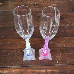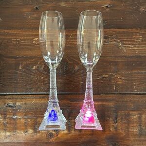 LED Eiffel Tower Stem Champagne Flutes. EUC. Elegant champagne flutes with Eiffel Tower stems with LED lights. One is blue and the other is pink. Batteries just replaced. Four different modes of LED lights – off, steady on, slow blank, fast blank. See video. Perfect for celebrations. This would be a unique gift as a way to announce a trip to Paris!