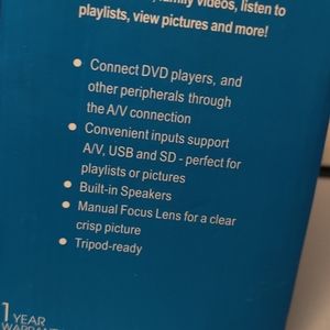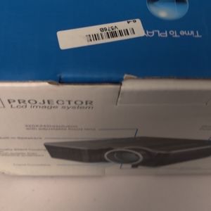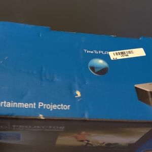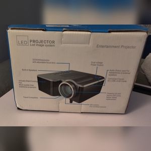 New in box, LED Entertainment Projector with LCD image system. This little projector is packed with all the comforts of your viewing pleasure, from movies, music playlists, family videos and more. Supports the following inputs: A/V, USB & SD cards, built-in speakers, 320x240 resolution, 20,000 hours LED lamp & tripod ready.