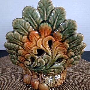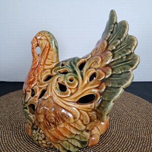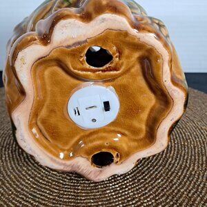 This glazed ceramic Turkey centerpiece is a Symphony of fall colors from greens, amber, brown, orange and red. There are beautiful oval, round and teardrop shaped cutouts on the breast, sides and top of the Turkey that emit a warm golden glow whenever you turn on the switch, that's on the base. All of my pictures are with the LED light on. It appears that these are either fruit or pumpkins on the front base of the Turkey. This item is unbranded and lovingly preowned. Measure 7 inches tall by 6 inches wide. Condition: No chips, cracks, breaks or any damage found. Has new batteries installed. Takes LR 44 batteries. Non smoking pet free home.