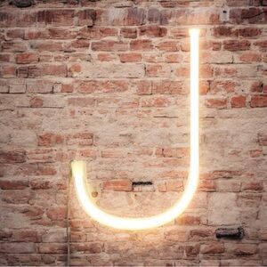 Stylish LED neon sign in white. Letter J. Perfect for modern decor. USB powered. 7.75” x 10”. Warm light.