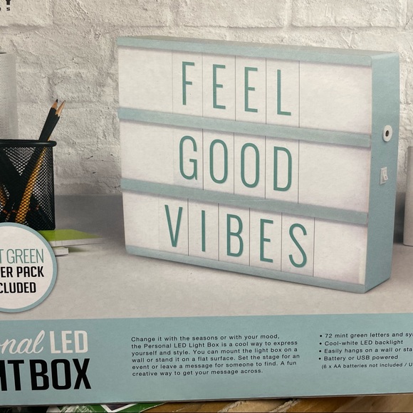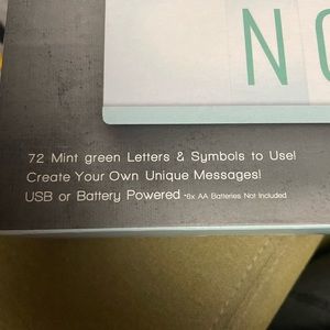 Personal size light box approx. 12 x 8. USB or battery operated. Includes letters and symbols. Mint/aqua color