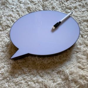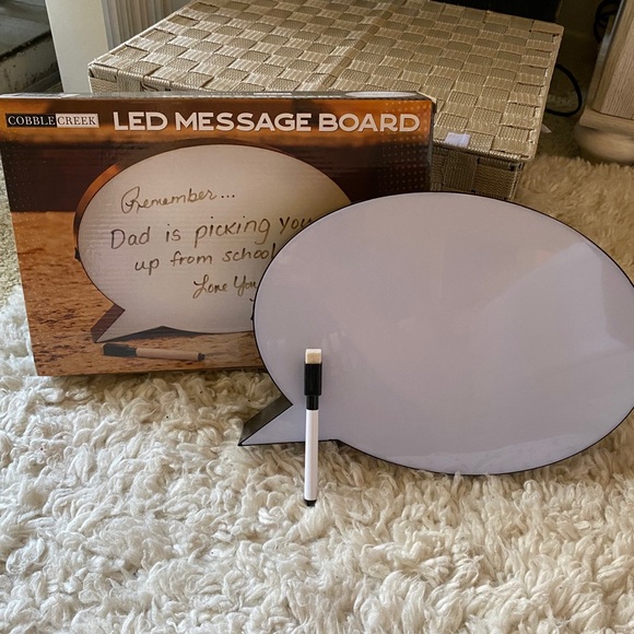 Cute LED light up message board that’s easy to wipe and write on. Fairly large size, so messages won’t be missed! Plastic material, so very light and easy to display. Dry erase marker included but AA batteries are not. BRAND NEW! Never been used so everything is shipped in original packaging.