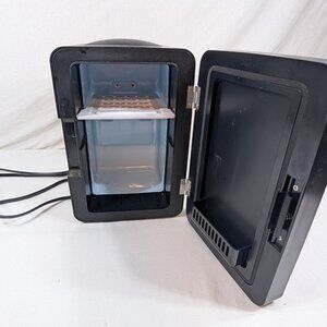 LED mini fridge black with LED lining on the front, can hold a 6 pk of cans shelf is removeable, has a cold/warm setting to it. I have never used the warm setting only the cold and was only used a short amount of time. In good condition works great, keeps drinks cold, comes from a smoke free home. Check out my other items for a bundle deal and save!