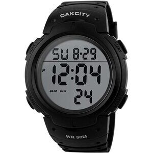Multifunction Watch: Auto Date, Alarm, Water Resistant, LED display, Shock Resistant, Stop Watch, Back Light. Waterproof: 164 Ft / 50 M water resist, Please DONOT press any buttons underwater, and in case of damaging waterproof ring ,please keep it away from steam and hot water.