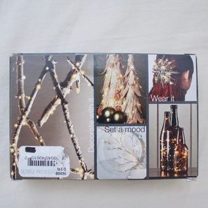 Lights require 3 AA batteries (not included). String is copper colored bendable wire that is 10' long (25 individual lights). Not sure what color lights are. Brnad new never used.