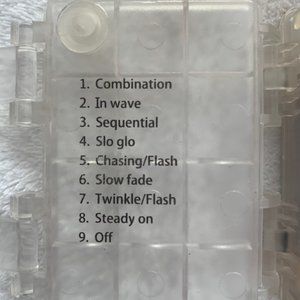 Settings: Combination, In Wave, Sequential, Slo Glo, Chasing/Flash, Slow Fade, Twinkle/Flash, Steady On and Off.