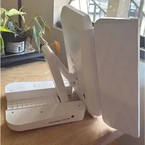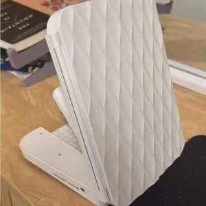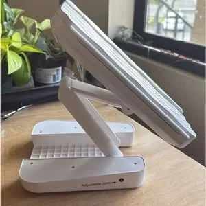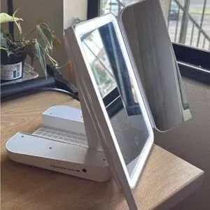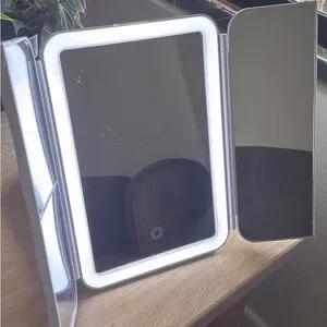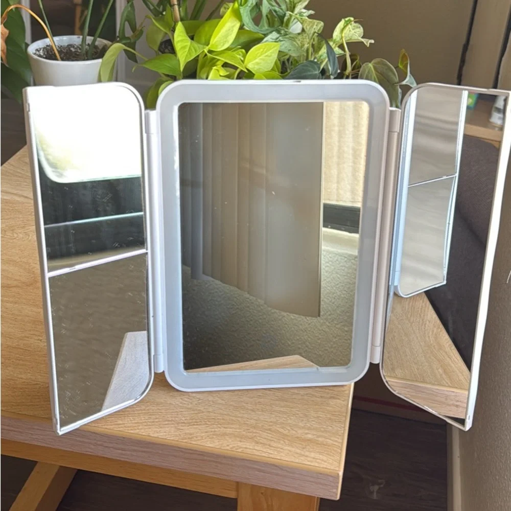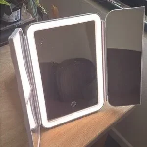 This vanity mirror is battery operated, barely even used (like new), and comes with 3 different lighting settings. It has 4 mirrors and they fold in to be more compact.
