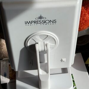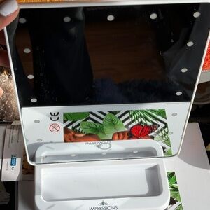 Sleek LED vanity mirror with touch control. Features a white frame. Perfect for makeup and grooming. Takes Double A Batteries (4)