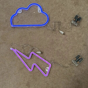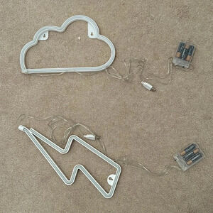 This is a set of two neon LED lights. One is in the shape of a lightning bolt and the other is a cloud. They each need three AA batteries. The cloud is 12 inches long and the lightning bolt is 13 inches long. One of the lights does not have a backing to hold the batteries in, but stays in on its own.