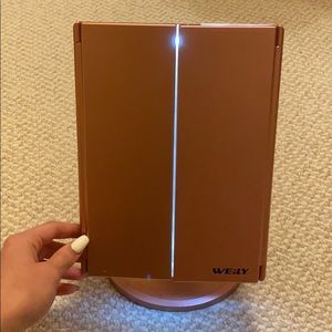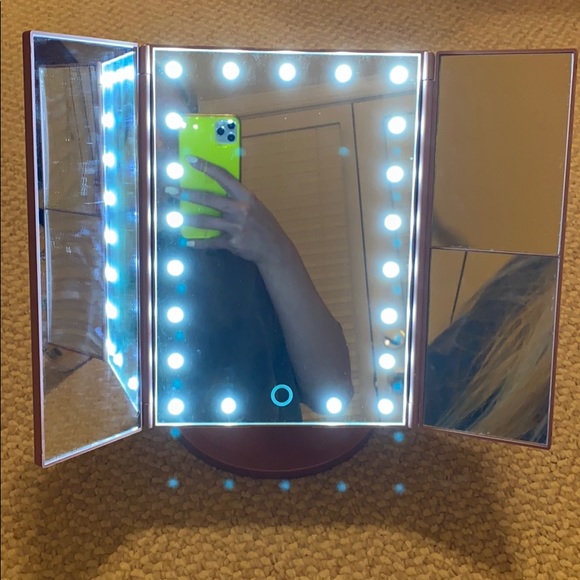 Rose gold trifold led vanity mirror with 1X, 2X, and 3X magnification and adjustable touchscreen lighting. Hardly used with brand new batteries