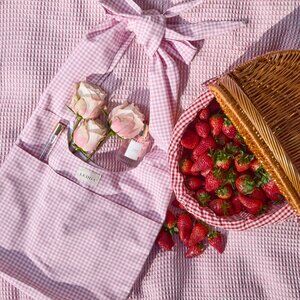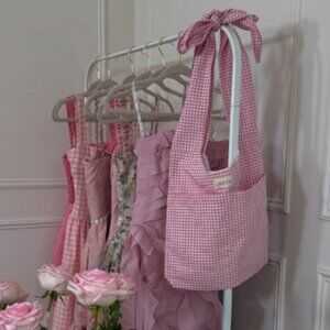 LEDDA Spring Pink Gingham Tie Shoulder Tote Bag, new in packaging. Exclusive tote bag from the Scenic Rose launch featuring a front pocket, white and pink gingham print, and tie straps.