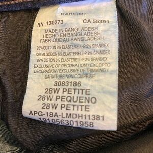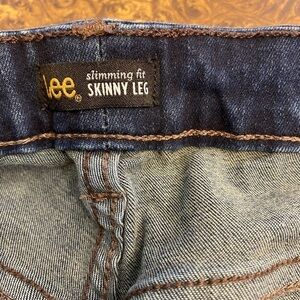 LEE Size 28 Petite Slimming Fit Skinny Stretch Preowned Jeans. These dark-wash jeans are in very nice condition! Waist measures approx 46”. Inseam measures approx 27”. Rise measures approx 12”. PA 221