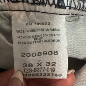 Zip fly with button closure. Five-pocket style. Belt loops.