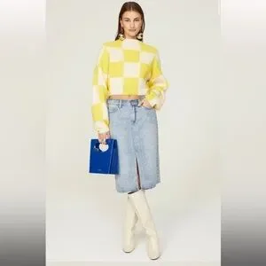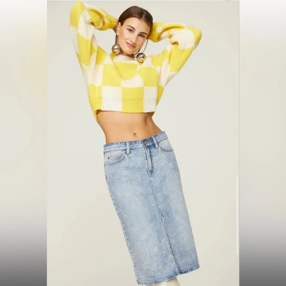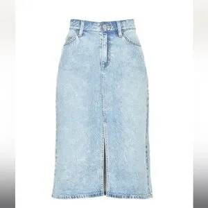 Blue denim (69% Cotton, 31% Lyocell). Midi. Front zipper fly with button closure. 39" from waist to hemline. Imported.