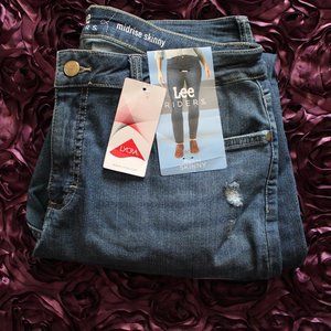 LEE Riders Women’s Midrise Skinny Premium Stretch Denim 5-Pocket Jeans (Medium Wash) Lee branded buttons and rivets Lee Riders, Midrise fit Iconic back pockets with S-curve stitching Hand-sanded finish Machine Wash The Lee Riders Women's Midrise Slender Stretch Skinny Jean combines premium fabric and a fantastic fit to create this must-have pair of jeans. The midrise fit sits at the waist, perfectly fitting and flattering your shape. This jean will look great with your favorite boots for a night
