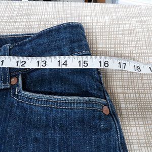 LEE Women's Capri Jeans Size 10 Just Below the Waist Medium Wash Blue Denim Button Flap Pockets. Good Pre Owned Condition. Waist 31 inches Rise 11 inches Inseam 18 1/2 inches.