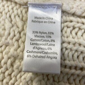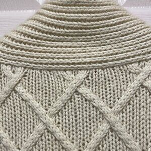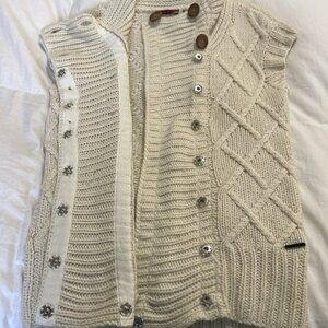 This gorgeous Sweater vest is a wonderful neutral to add to your fall closet. Cable knot, cream, with large buttons, front cross over snap closure, cowl neck, sleevless but with a slight cap, wool blend, super sogt and cozy. The perfect extra layer for the fall and winter chill.