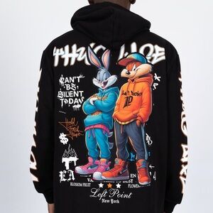 This black hoodie features a vibrant graphic design, perfect for adding a pop of color to your casual wardrobe.