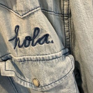 Stylish light blue denim shirt featuring 'hola' embroidery. Perfect for casual wear- as a lightweight jacket or shirt. Cool buttons and a design on back too