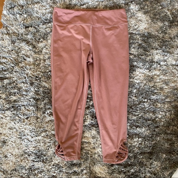 Pink Capri leggings with cut outs at bottom • Used condition with some pulling on thigh area • Size small