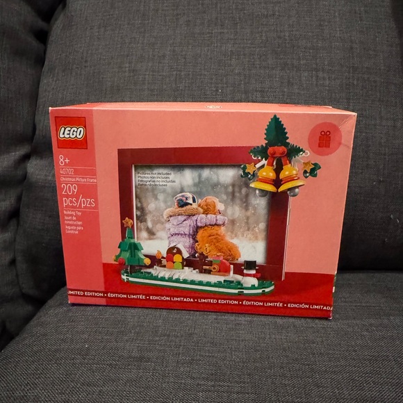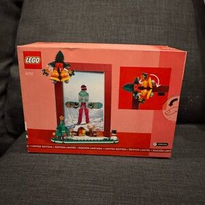 LEGO set featuring a festive photo frame. Includes a train and decorated tree. Ideal for holiday displays.
