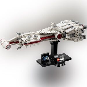 Build the excitement you felt when you watched the opening scene of Star Wars: A New Hope all over again with this buildable LEGO® brick model of the Tantive IV starship. Feel the power of your creative force as you capture instantly recognizable details of an iconic starship, first seen being chased by a Star Destroyer. Place your Star Wars™ vehicle on the buildable stand and add the nameplate and a LEGO Star Wars 25th anniversary brick to complete an attention-grabbing centerpiece.