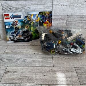 LEGO set 76143 featuring Avengers theme. Includes black and gray vehicle parts. Comes with character figures.