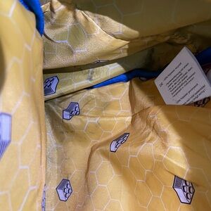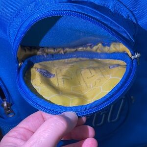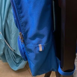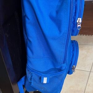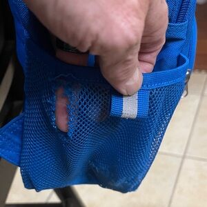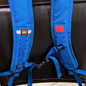 Bold blue LEGO backpack with dual front circle pockets. This is a used backpack. Rip in side mesh but does not affect use. Stains on backpack from use. Purchased from Legoland three years back.