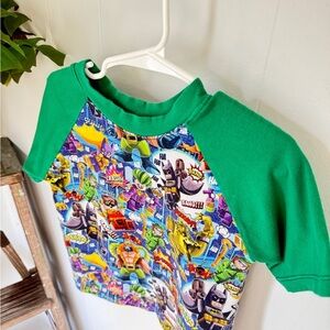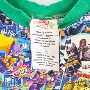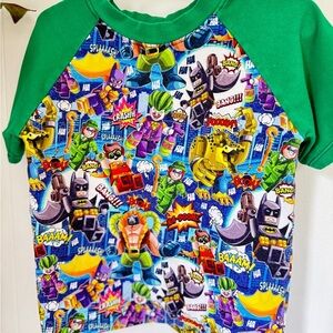 Pow! Bam! Splash! This one-of-a-kind boutique shirt is a comic book dream come true. Handmade in the USA by Cloth by Connor, it features a vibrant LEGO Batman print packed with action β heroes, villains, and all the colorful chaos! π₯