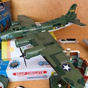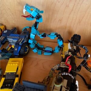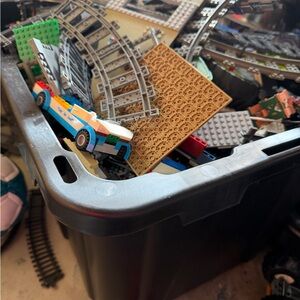 LEGO train tracks and other pieces. Many partially built and fully built Legos. Have not verified that all pieces are there, selling as is. Few pieces may be Cobi. Military vehicles, planes and helicopters are Cobi.