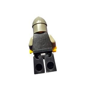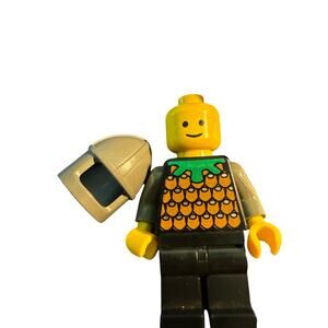 LEGO Castle minifigure, Dragon Knights LEGO, medieval LEGO knight, kettle helmet LEGO, vintage LEGO smiley head, LEGO army builder, LEGO classic castleGray Kettle Helmet Brown patterened torso with Green collar, black legs, gray arms and classic smiley face head.
