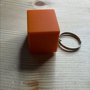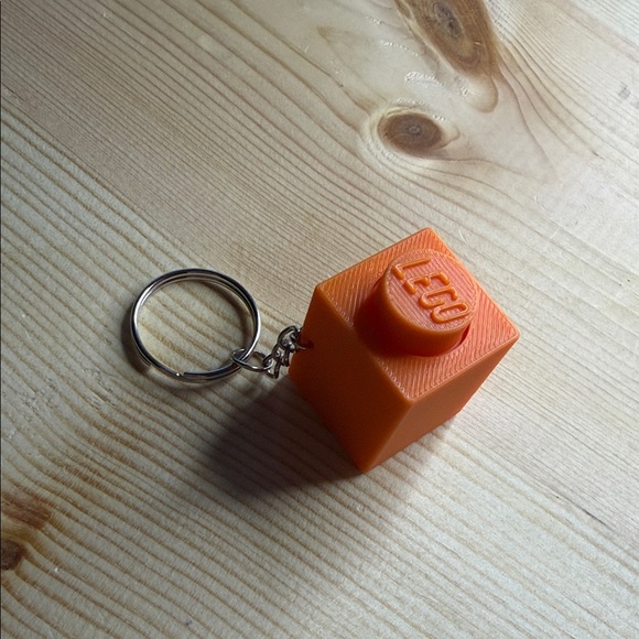 Orange Lego keychain with clicker inside