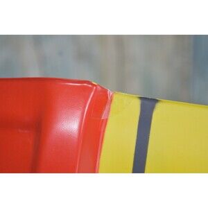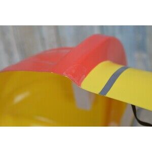 This mask has a small, hairline crack on each side where the red hard hat meets the yellow face. To prevent these from spreading and to ensure there are no sharp edges, I have carefully applied a small piece of clear, durable tape over each spot (please see the close-up photos for details).