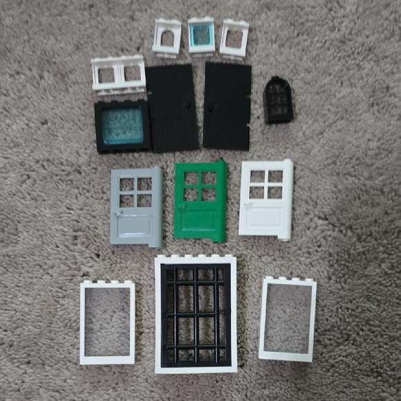 LEGO set with various doors and windows. Includes green, black, white, and gray pieces. Ideal for creative builds. ✨️
