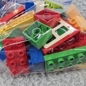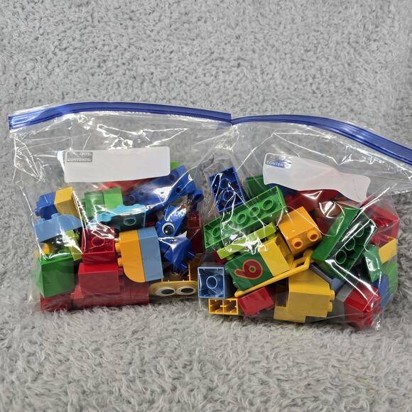 Includes two zipper storage bags filled with assorted Duplo bricks and parts in multiple bright colors.