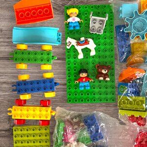 Includes a curated selection of activity pieces, gears, slides, track, figures, wheels, and colorful Duplo elements — most still sealed in original bags.
