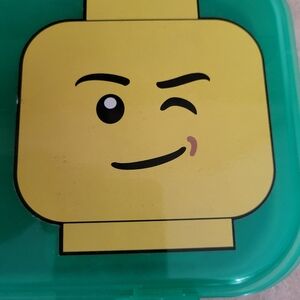 Fun LEGO storage box. Features a winking face design. Perfect for organizing small items.