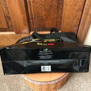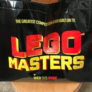 Lego Masters - The Greatest Competition Ever Built on TV; Reusable Shopping Tote; Black w/Red & Yellow Block Letters; Black Double Handles; Side Panels: (1) Red & (1) Yellow; Bag was sustainably sourced; No signs of use or wear; Across 16"; Up/Down 12"; Bottom Base 5.5"; Handle Drop 8"