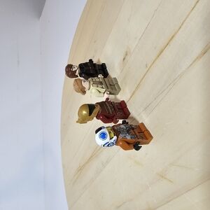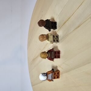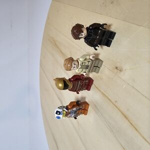 Set of four LEGO minifigures in various outfits. Includes colors like black, tan, red, and brown.