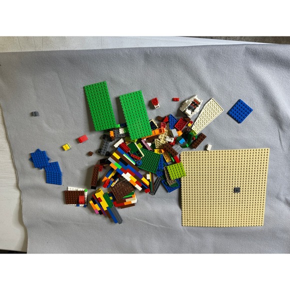 Assorted collection of genuine LEGO building pieces features a variety of colorful bricks, plates, and specialty components. This mixed lot includes several baseplates in green, blue, and tan, along with wheels, windows, and unique structural elements. Perfect for creative free-building or expanding an existing collection, these pieces offer endless possibilities for custom projects and imaginative play.