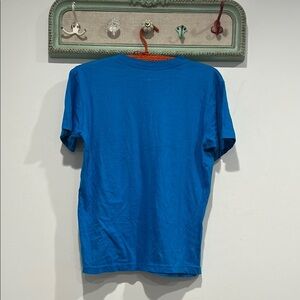 Vibrant, blue short sleeve crewneck, pullover T-shirt, graphic shows some distressing, no holes or stains