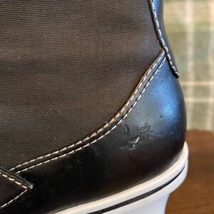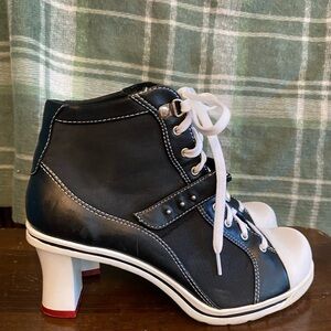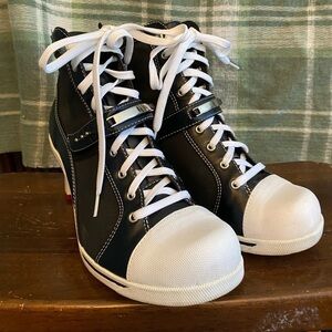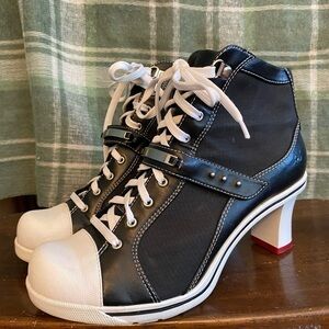 L.E.I. Christy faux leather and canvas Y2K high heeled lace up sneaker 9.5. Minor faux leather imprints and scary aches from storage. 2.5 inch heel. Lace front with Velcro over strap.