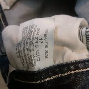 These LEI jeans in size 17S feature a dark wash denim with flap pockets and whisker wash detailing. The hipster flare style has embroidered logos, offering a retro look suitable for casual occasions. Made of a cotton blend with stretch for comfort, these jeans are designed for women and have a high rise fit. Perfect for winter, summer, fall, and spring wear.