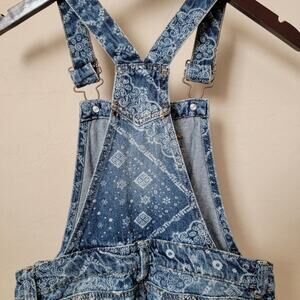 L.E.I. denim shortalls, size medium (7/8). Print. Rolled cuff. Adjustable straps. Shoulder snaps. Double side button closures. Front chest pocket, front pockets, back pockets. Waist belt loops. Non-stretch. Does not have an adjustable waist.