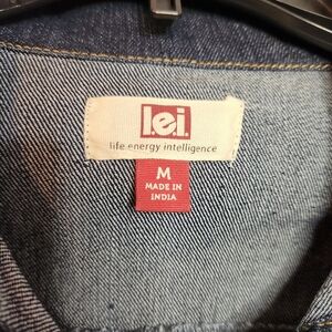 •L.E.I Denim Leather Jacket Size Medium Juniors NWT. Life energy intelligence. Ryder leather sleeve denim jacket. 05/2013. Color: dark stone.