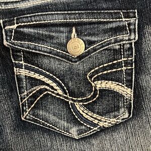 LEI Sophia Hipster Flare Jean Dark Blue Embroidery Whispered Flap Pocket 13S/29L