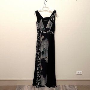 Multi pattern silk dress with hidden side zipper and sheer panels in front and back. High slits on each side. Worn twice. Excellent condition. Smoke free home.