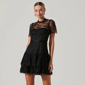 The Leilani Dress is a lace dream come true. It has a sheer lace overlay that features a scalloped collar and short sleeves. Bustier front frames your figure and adds a touch of sexy. Mini skirt features a tiered ruffle design in lace. Back zip closure.